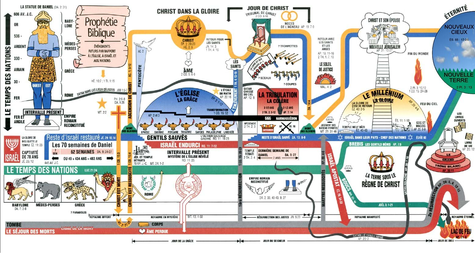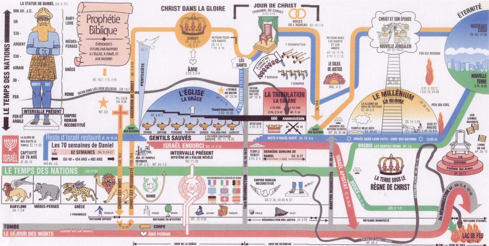 Vues détaillées sur des points particuliers, parenthèse de l'Église Israël + Israël comme sujet traité sur une page à part Les Nations (Gentils ou Goïm), le temps des nations Empire romain Babylone, Oecuménisme Les derniers jours – La Grande Tribulation, Armaguédon, l'Assyrien Antichrist, Apostasie Royaume de Christ ou Millénium Jugements de la fin, Fin du monde, L'état éternel, le Paradis